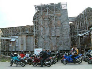 Wir stiegen auf unsere Böcke und folgten den beiden zwischen alten Industriegebäuden hindurch, vorbei an die Security zu einem großen Platz, wo man riesige Holzgerüste und Bretterwände vor sich hatte.