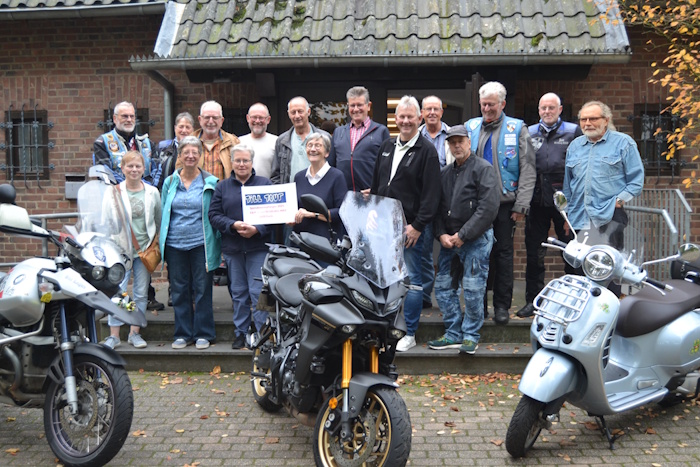 Nach ihrer erlebnisreichen und vor allem unfallfreien Tour trafen sich jetzt 14 der beteiligten Motorfans beim Fair-teiler im Pfarrheim St. Markus in Bedburg-Hau, um den bei der Tour gesammelten Spendenbetrag von 1.620 Euro zu überreichen und damit die Arbeit der Tafelorganisation zu unterstützen. Auf dem Foto nimmt Margret Schild (vorne,4.v.l.) vom Fair-teiler den symbolischen Spendenscheck entgegen.